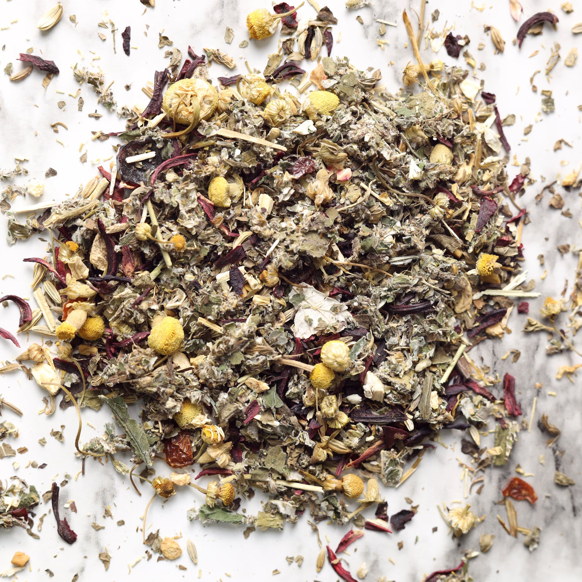Chamomile, Red Raspberry Leaf, Hibiscus, Ginger, Fennel, Rosehip, Fenugreek, Mugwort, Lemon Balm