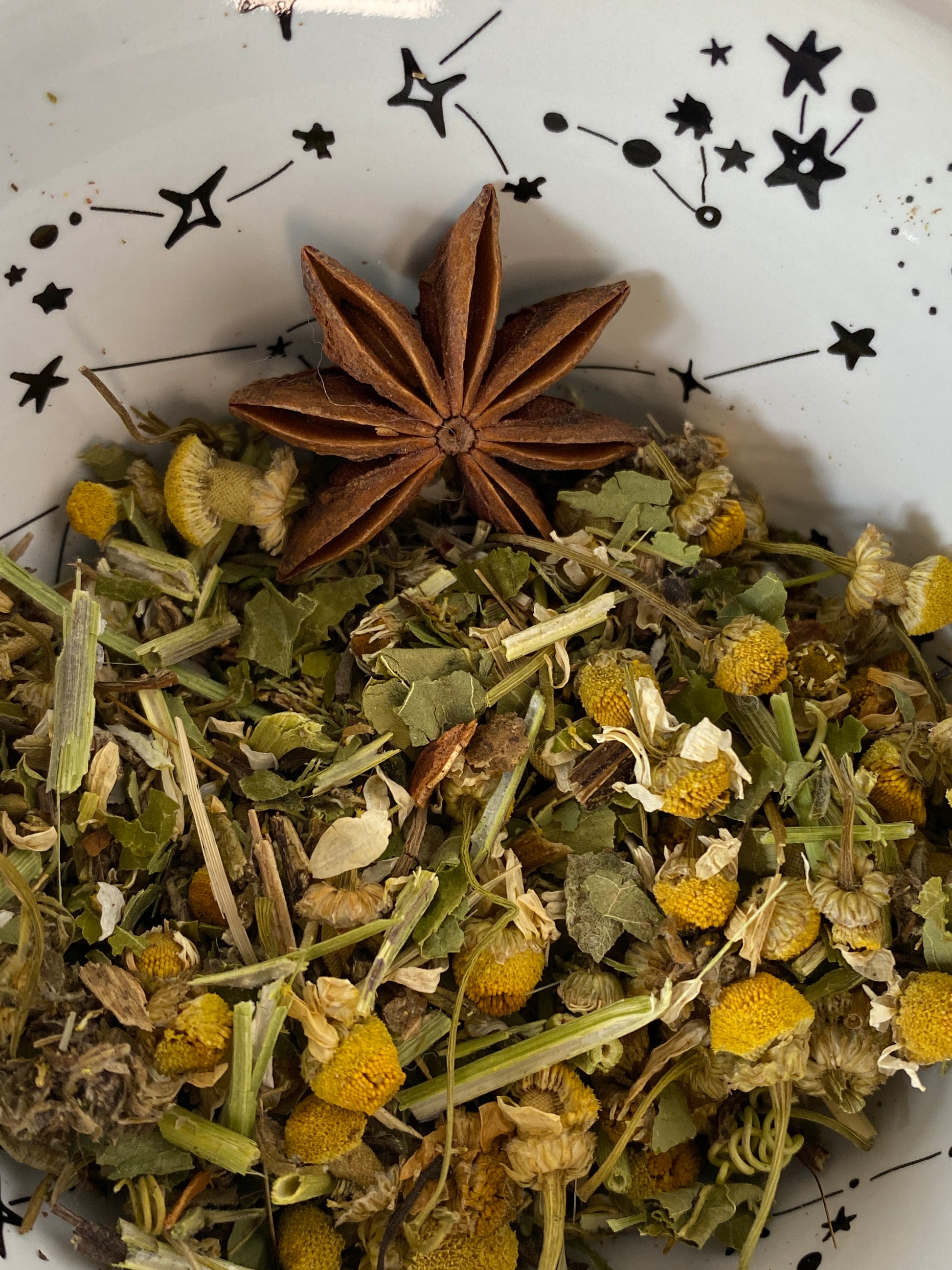 Chamomile, Passionflower, Valerian Root, Mugwort, Star Anise