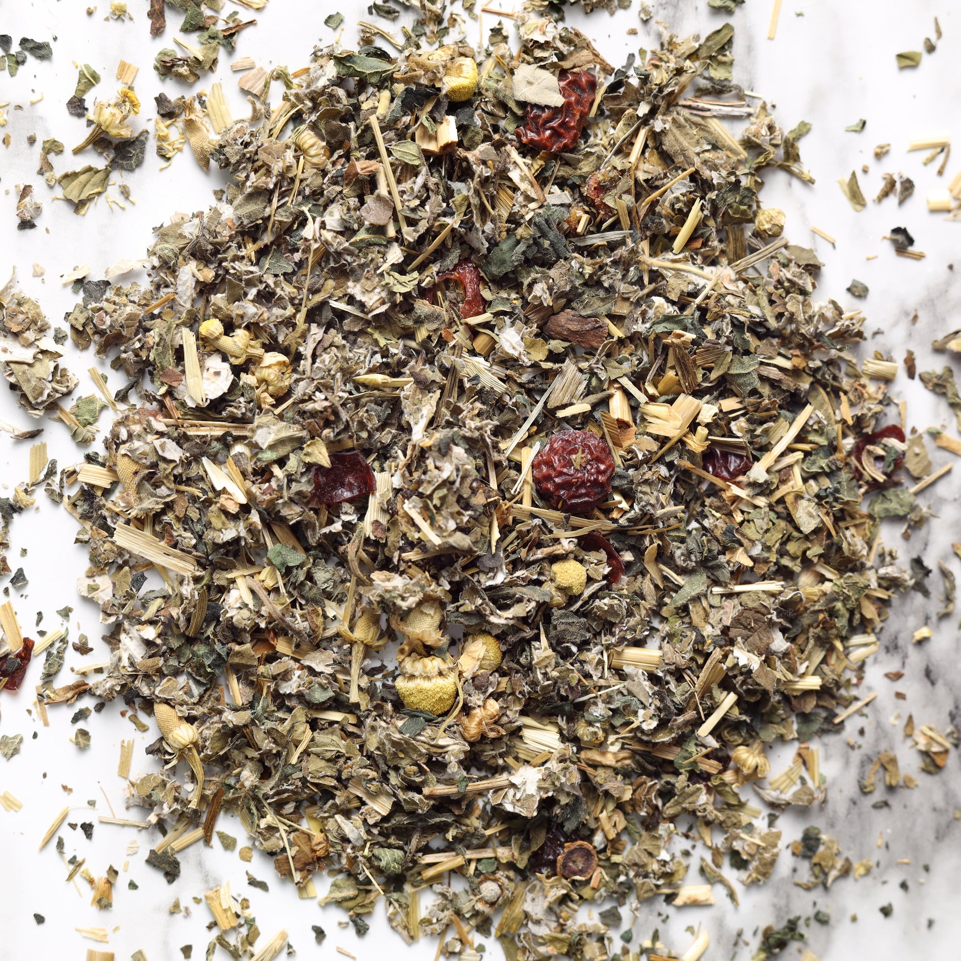 Nettle, Peppermint, Red Raspberry Leaf, Rosehip, Oatstraw, Chamomile, Dried Dates, Natural Blackberry Extract