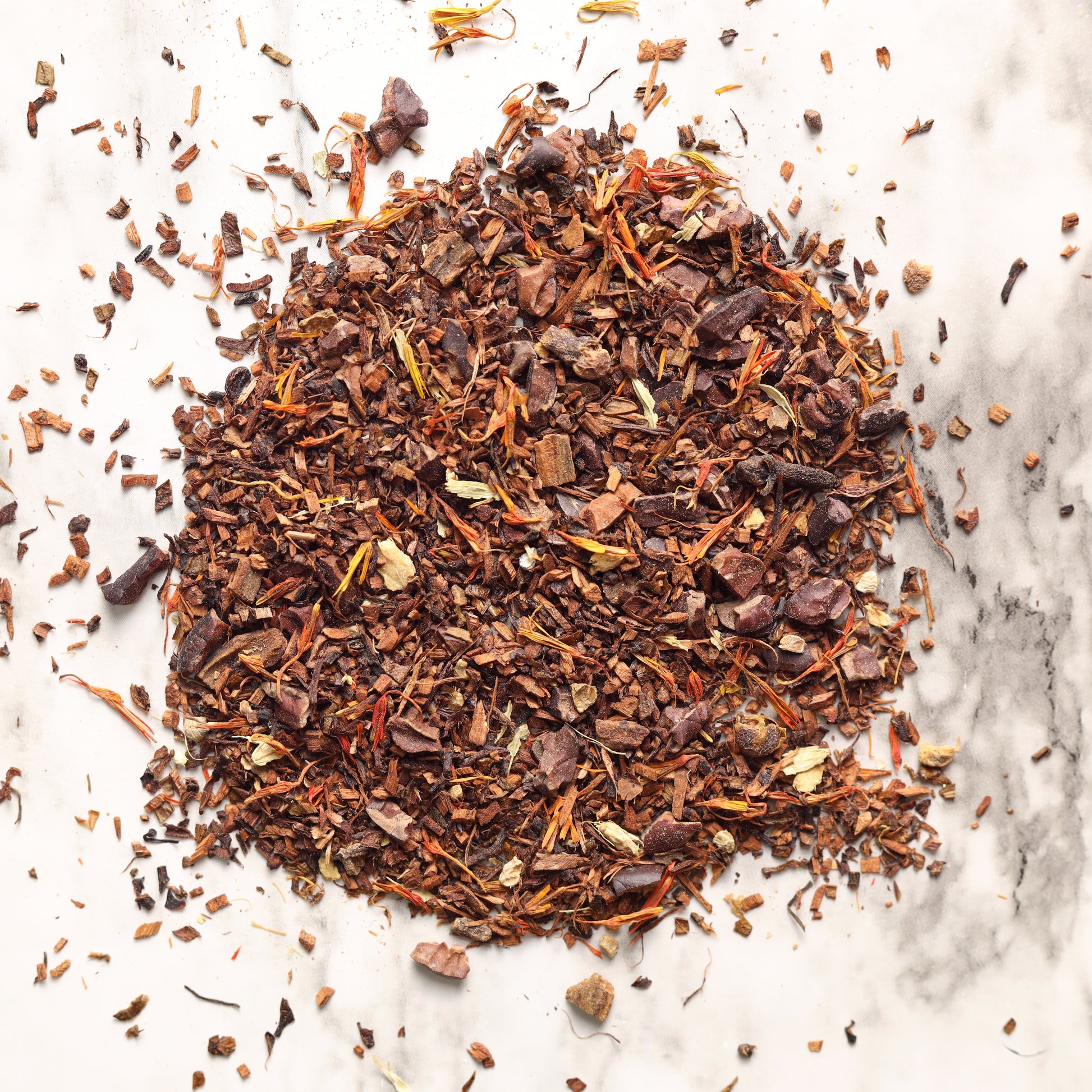 Honeybush creates a smooth, naturally sweet base with notes of honeyed woodlands. Cocoa nibs, natural walnut flavoring, and a medley of warming spices—cinnamon, cardamom, ginger, clove, nutmeg, allspice—stir up that unmistakable pumpkin spice charm without being overpowering. Safflower petals bring a golden pop of autumn color to round out the visual and energetic beauty of this brew.
