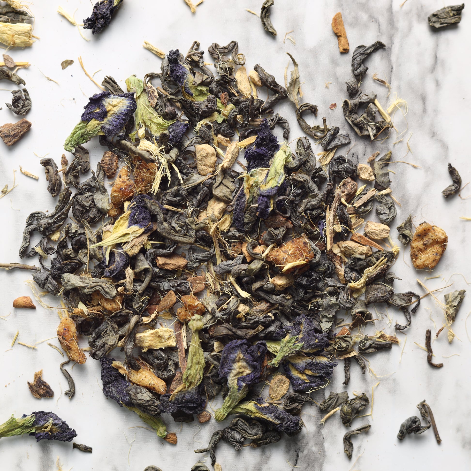 Sapphire is a Young Hyson green tea blend, brightened by juicy pear and crowned with blue peaflowers for an otherworldly hue. A touch of ginger, cinnamon, and nutmeg offer gentle spice, while licorice root smooths the edges with natural sweetness. The result is light yet grounded, sweet yet complex—a balanced brew to sip during quiet contemplation, seasonal transitions, or when you're craving clarity and grace.