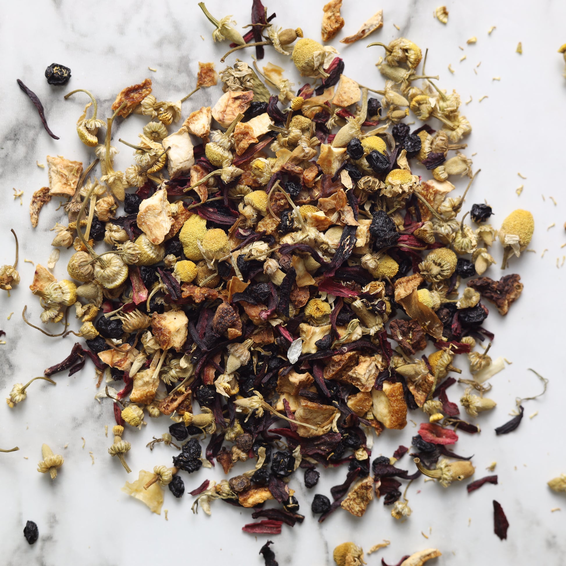 Chamomile, Elderberries, Orange Peel, Lemon Peel, Hibiscus, Natural Passionfruit Flavor